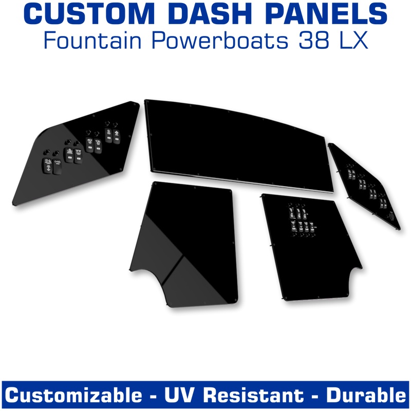 The Fountain Powerboats 38 LX console consists of a 5-part dash setup. There is a top dash panel, port & starboard side dash panels and port & starboard side switch panels. This listing is for a blank top dash panel, blank port & starboard side dash panels and blank port & starboard side switch panels or, a pre-designed starboard side dash panel, a pre-designed port side switch panel, and a pre-designed starboard side switch panel. You can purchase the custom panels independently or you can purchase the entire 5-part dash setup.
