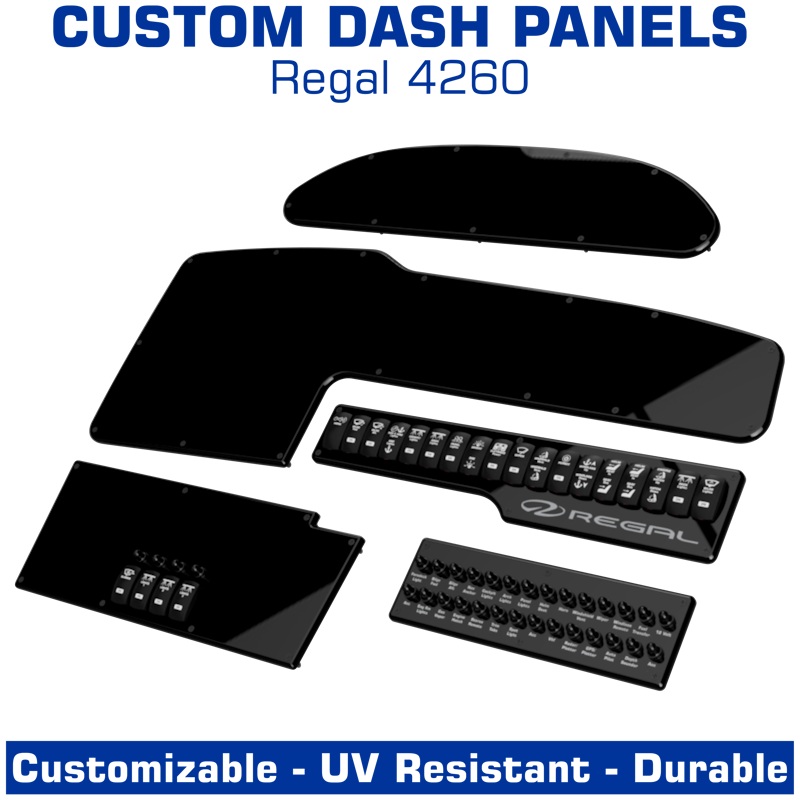 The Regal 4260 console consists of a 5-part dash setup. There is a gauge panel, a large instrument panel, a switch panel, a bottom instrument panel and a circuit breaker panel. This listing is for a blank gauge panel, a blank large instrument panel, a blankswitch panel, a blank bottominstrument panel and a blank circuit breaker panel, or a pre-designed switch panel, a pre-designed bottominstrument panel and a pre-designedcircuit breaker panel You can purchase the custom panels independently or you can purchase the entire 5-part dash setup.