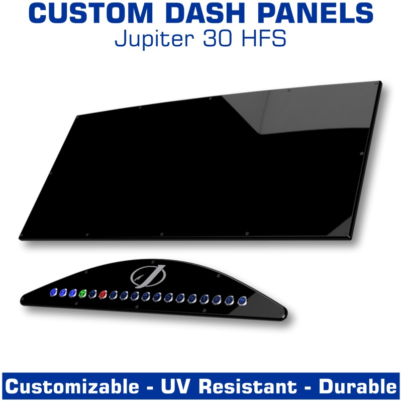 Replacement center console dash panels (two parts).The Jupiter 30 HFS console consists of a 2-part dash and switch panel setup. There is a dash panel, and a switch panel. This listing is for a blank dash paneland/or a blankswitch panel, or a pre-designed s