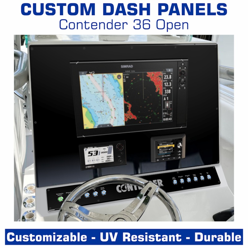 Replacement center console dash & switch panels (twoparts).The Contender36 Open consoleconsists of a 2-part panel setup. There is a dash panel, and a switch panel. This listing is for ablankdash panel,and a blankswitch panelor pre-designedswitch panel.Upgr