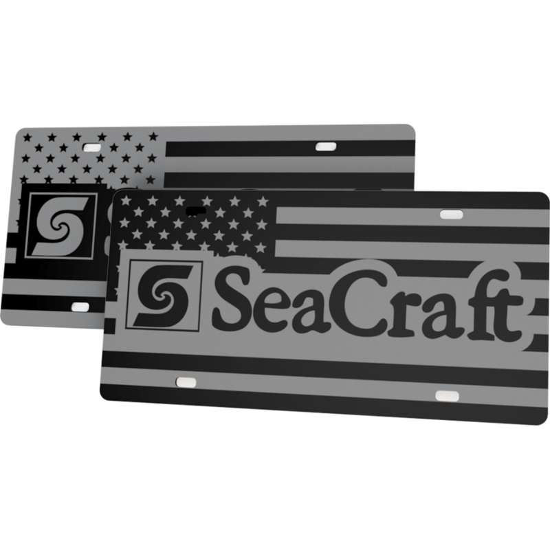 This extremely high gloss black acrylic license plate is 1/8″ thick and boasts a beautiful American Flag image behind the iconicSeaCraft logo.