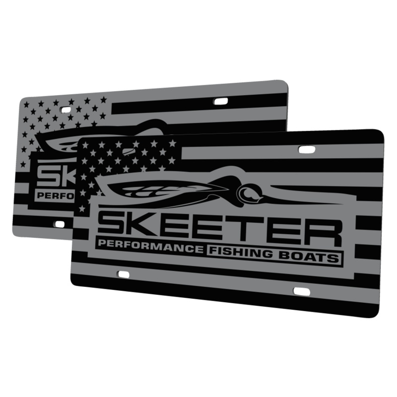This extremely high gloss black acrylic license plate is 1/8″ thick and boasts a beautiful American Flag image behind the iconicSkeeter logo.