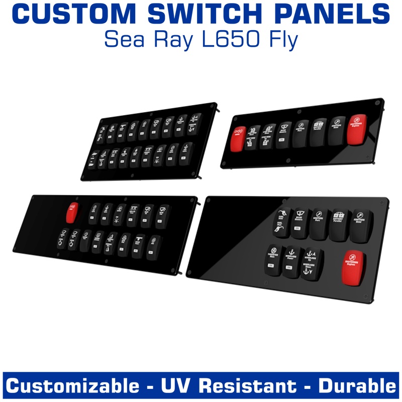Upgrade options are listed below and can be added during the next step; the design! We recommend you purchase all the switch panels for the Sea Ray L650 Flyand let our design team come up with something custom and incredible for your boat and your needs.