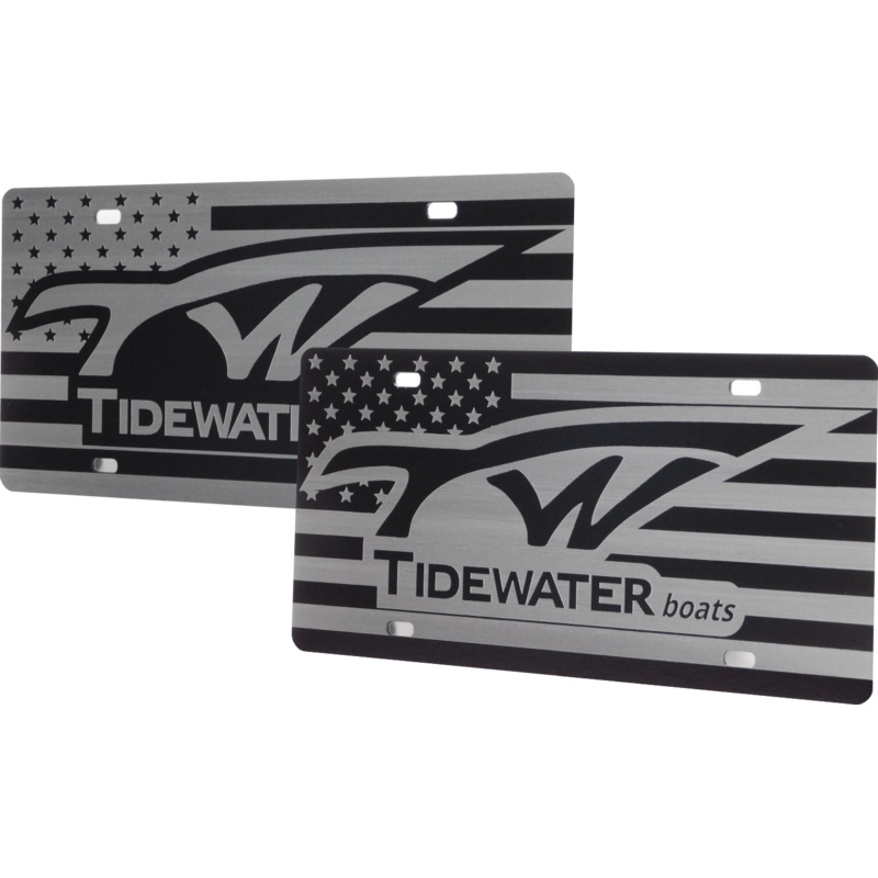 This extremely high gloss black acrylic license plate is 1/8″ thick and boasts a beautiful American Flag image behind the iconicTideWater logo.